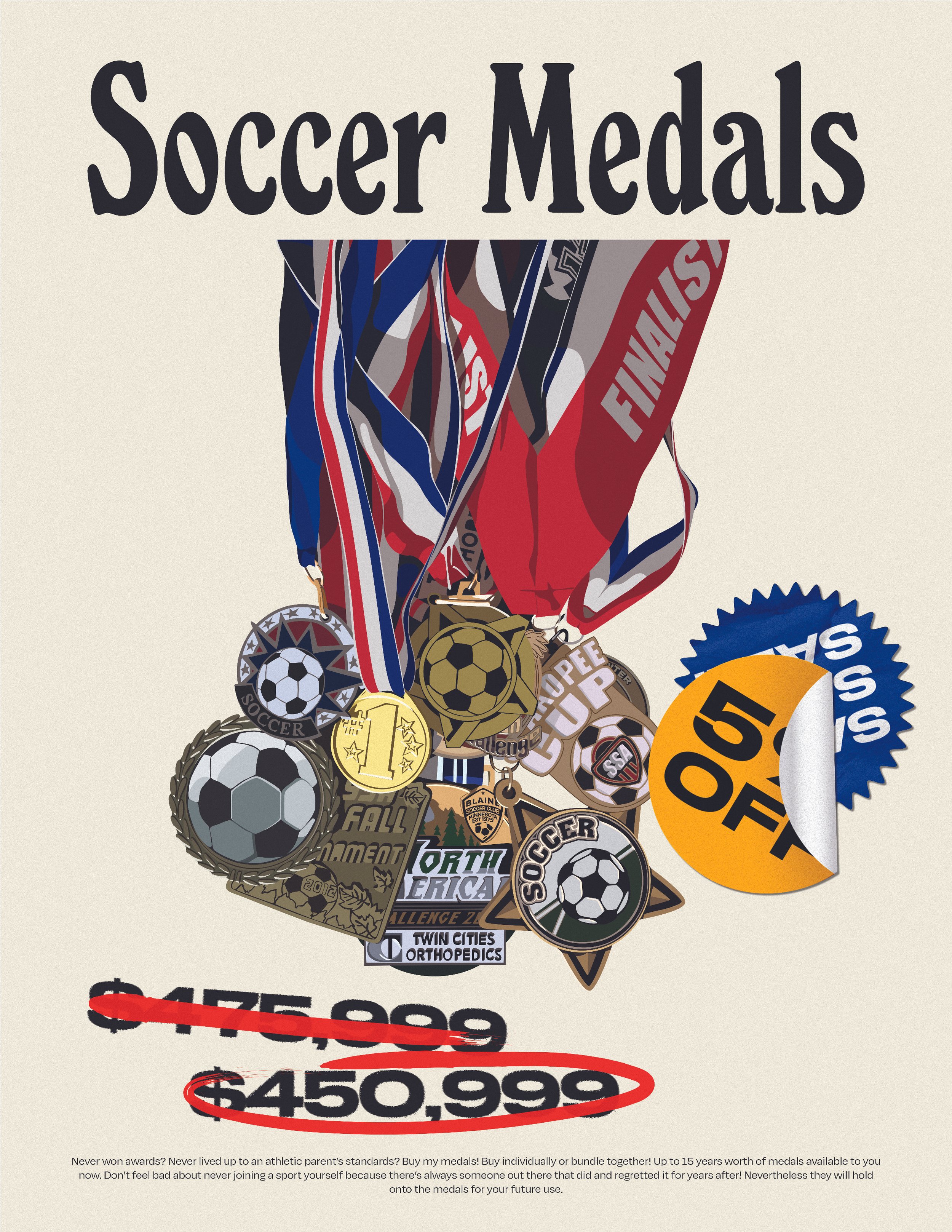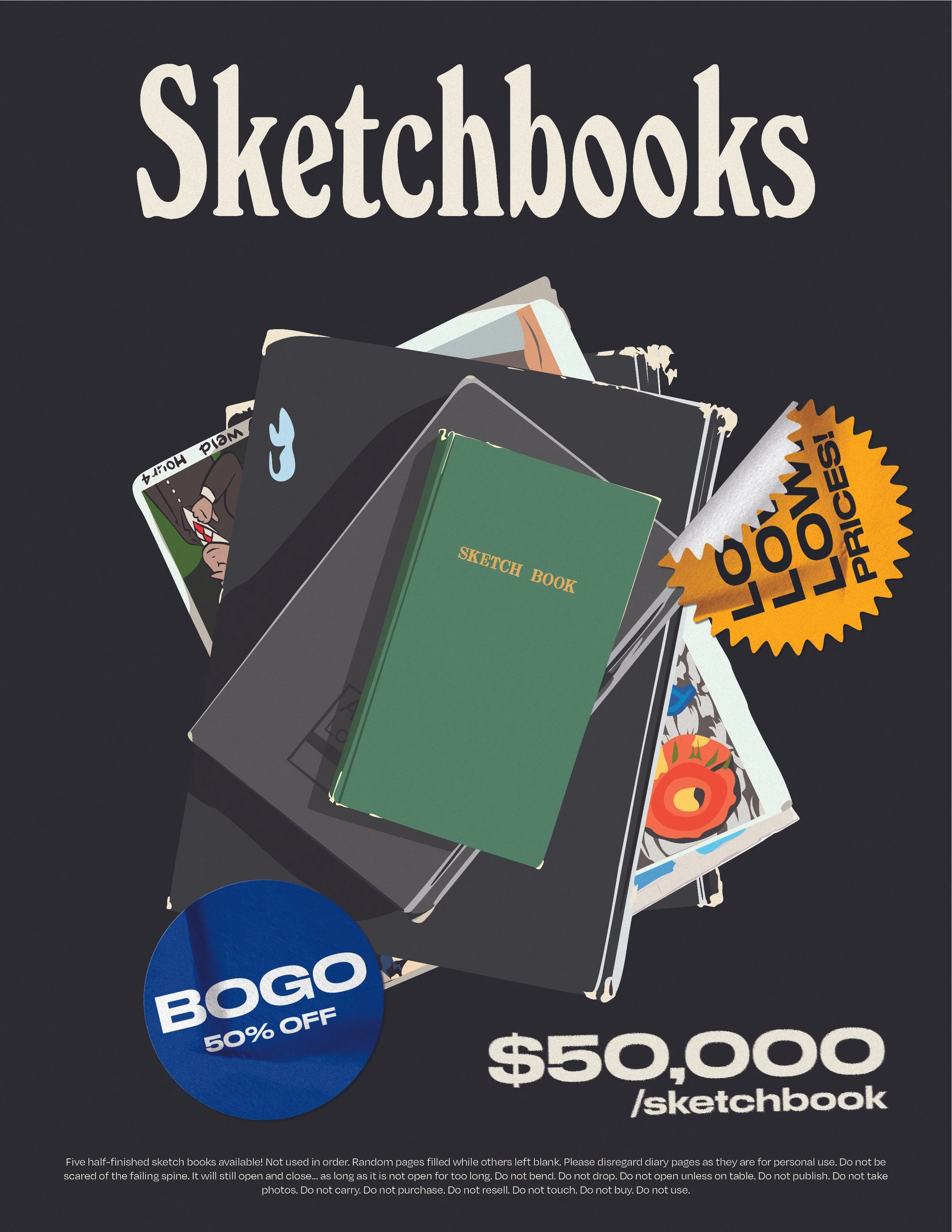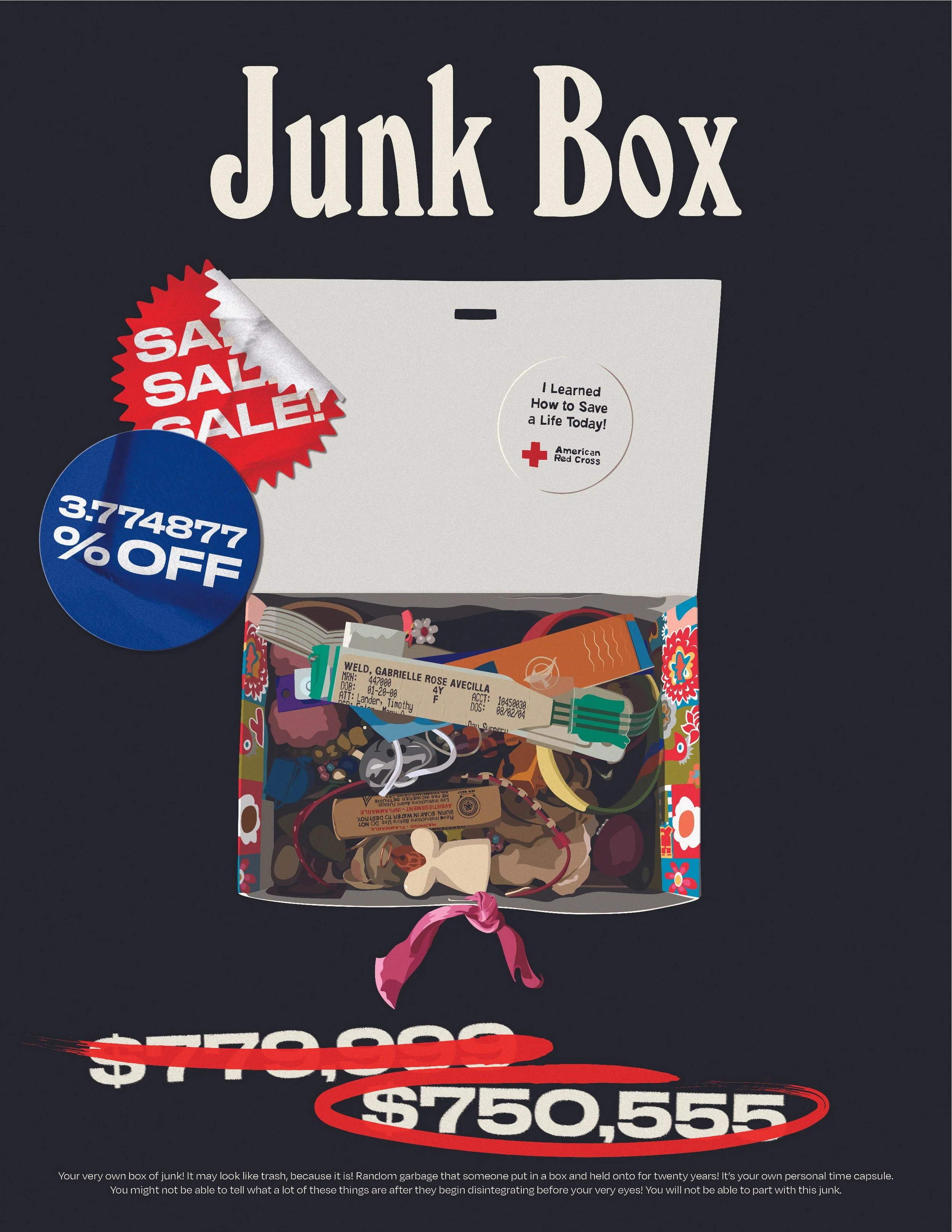An examination of our relationship with the things we keep, whether for a reason or not. Exploring items I have collected over the years through many houses, I reflect on the way moving (more or less 20 times) has impacted the way I view materiality and what is important to me in terms of physical things. This collection features illustrated advertisements of the things I have deemed important enough to keep in my life over the past 22 years. Browse these items at record low prices - determined arbitrarily - but nevertheless on massive sale. Up to 50% off!